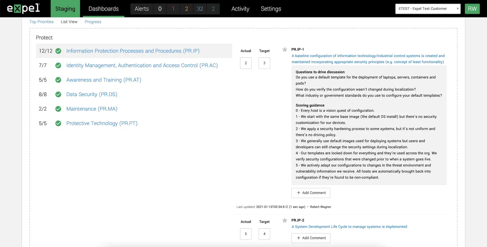 Expel sought to give its customers an easier way to enter and track their National Institute of Standards and Technology (NIST) scores. To date, customers had tracked their progress in an Excel spreadsheet with plenty of manual support from folks at Expel. This new system would allow users to enter their scores into a step-by-step wizard right in Expel Workbench™, and explain what each score meant. It would also provide informative charts and graphs for a quick glance at a customer’s NIST progress.
